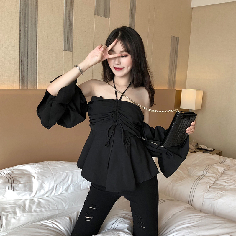 2018新款韓版小心機百搭復古chic氣質時尚女一字肩燈籠袖雪紡上衣