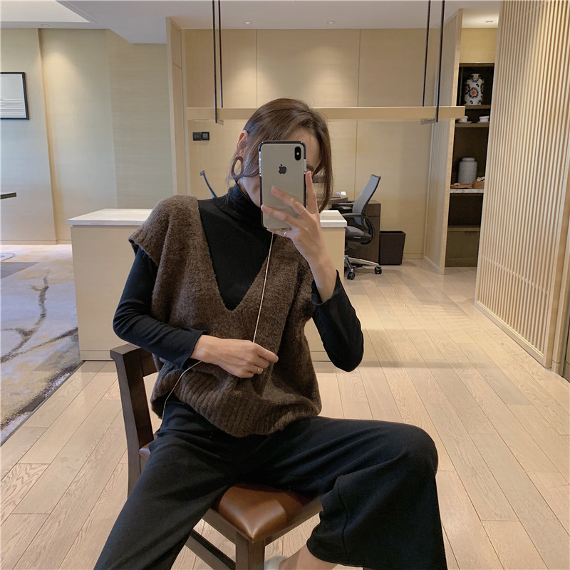 / 秋裝女2018新款套裝復古針織毛衣背心+高領打底+純色闊腿褲三件套