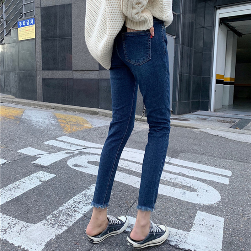 / 高腰顯瘦加絨緊身牛仔褲女秋冬裝新款不規則毛邊休閑鉛筆九分褲子