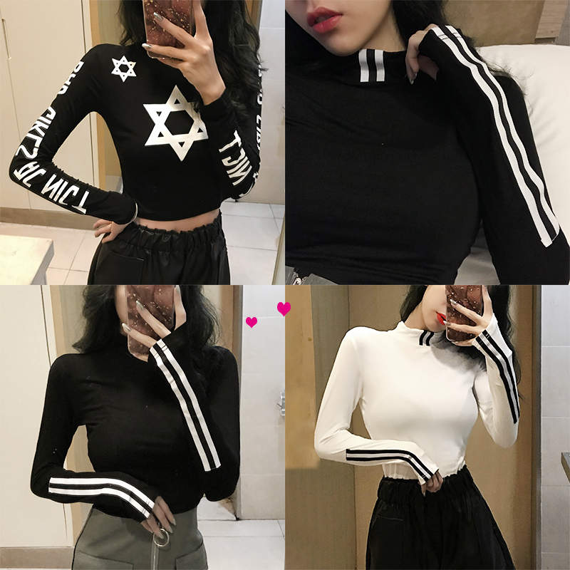 / 韓版chic風冬裝上衣女慵懶長袖t袖女顯瘦半高領印花百搭打底衫Tee