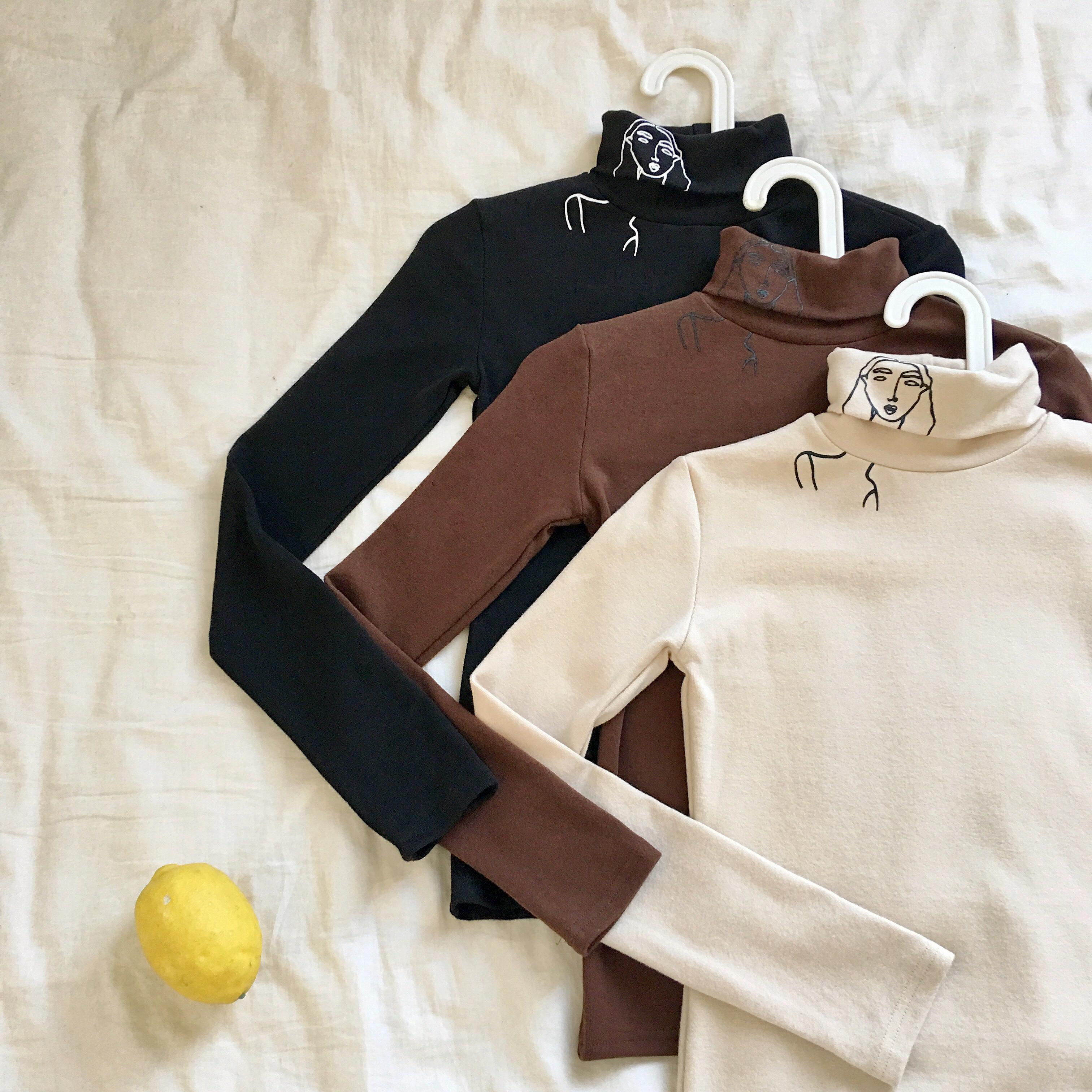 / 秋季韓版chic復古百搭個性人頭高領長袖打底衫修身顯瘦T恤上衣女