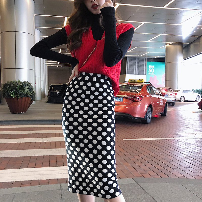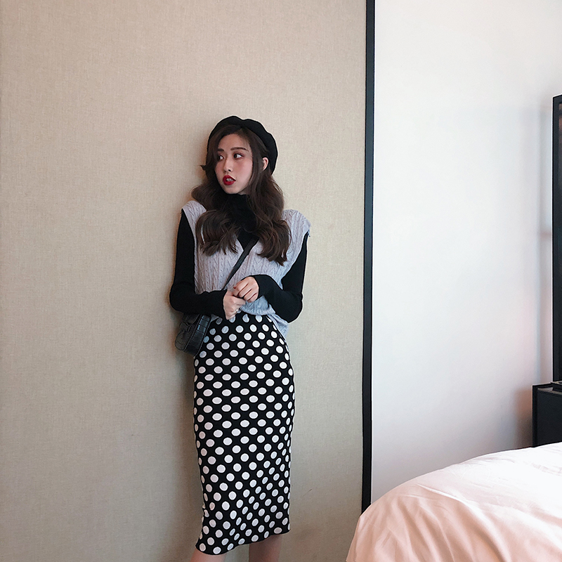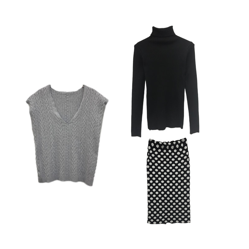 包芯紗V領無袖毛衣背心+高領打底針織衫+波點半身裙時尚三件套裝