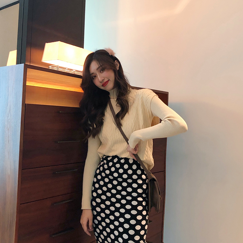 / 包芯紗V領無袖毛衣背心+高領打底針織衫+波點半身裙時尚三件套裝