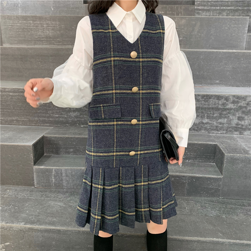 御姐套裝女秋冬新款學生復古V領格子連衣裙網紗寬松長袖襯衫上衣