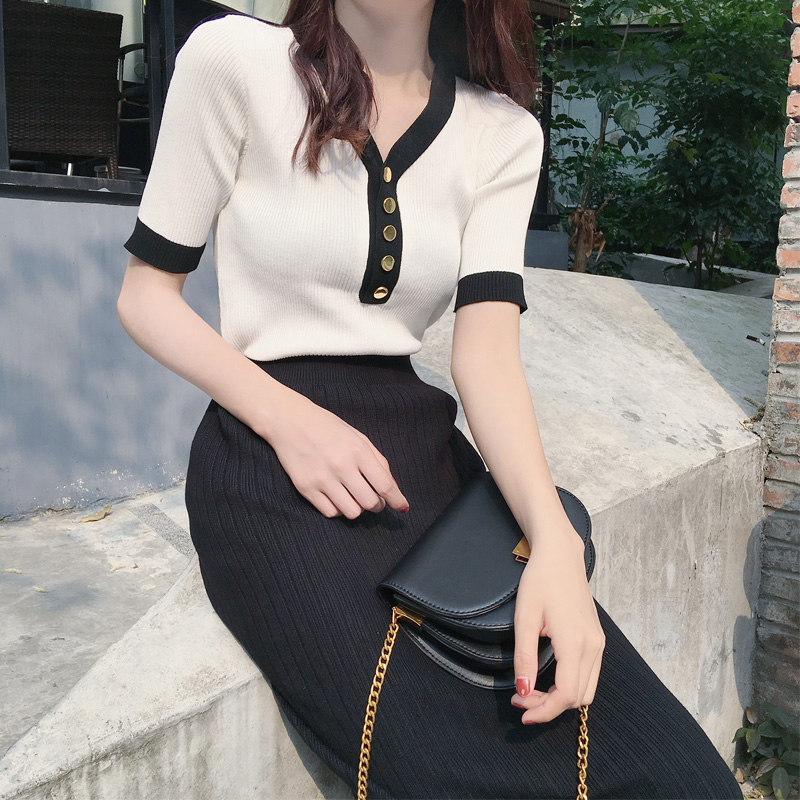 短袖女新款港味chic針織衫時尚V領撞色邊單排扣百搭修身顯瘦上衣