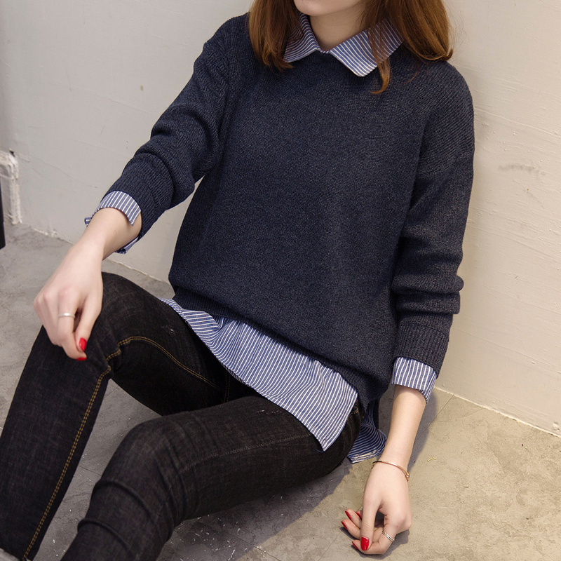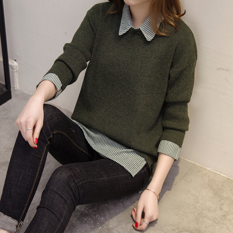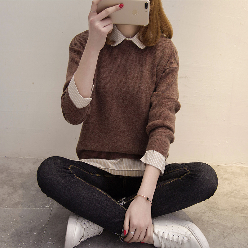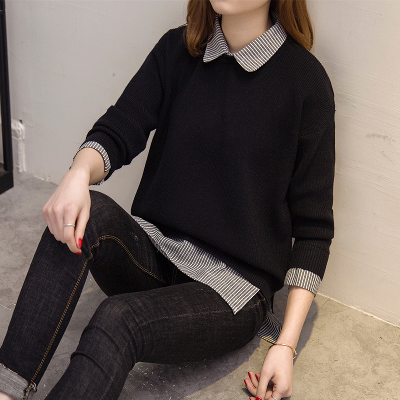 / 毛衣女秋冬韓版套頭寬松娃娃領假倆件針織衫加厚純色毛衣打底外套