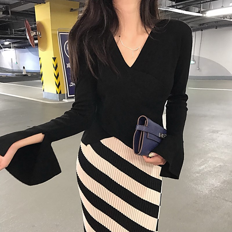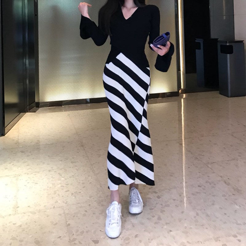 套裝女秋2018新款V領打底針織衫條紋中長款包臀半身裙氣質兩件套