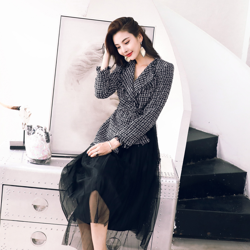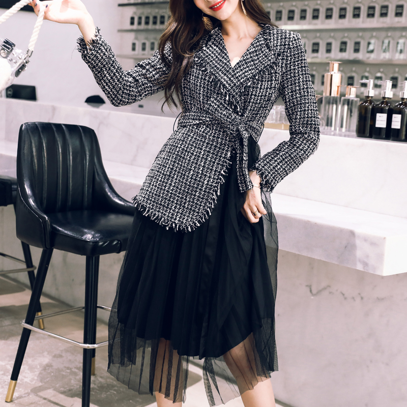 / 2018秋裝新款時尚休閑個性時髦毛呢西裝外套拼接網紗顯瘦連衣裙潮