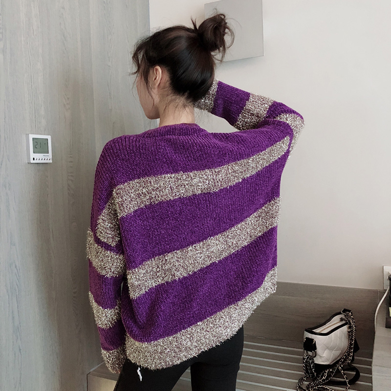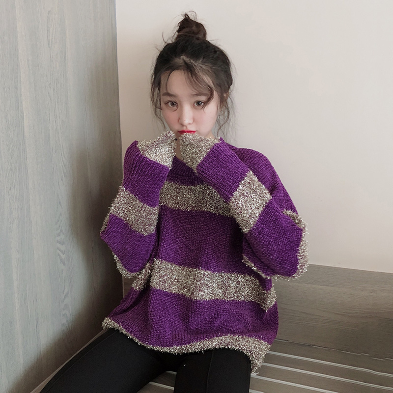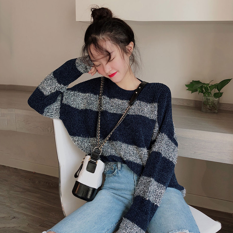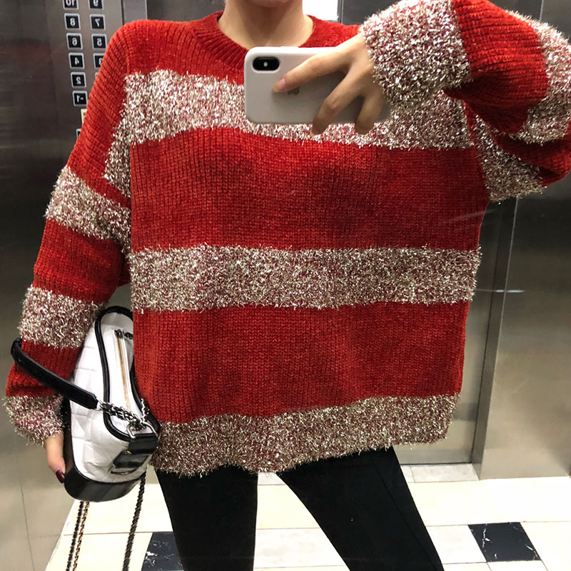 慵懶條紋毛衣秋裝女2018新款港味復古亮絲長袖針織衫寬松休閑上衣