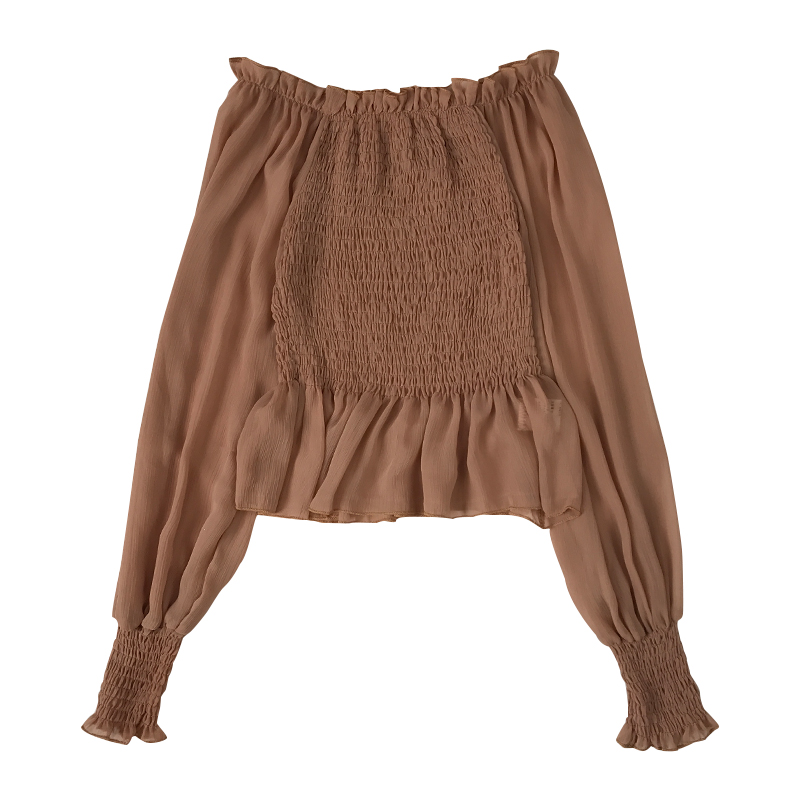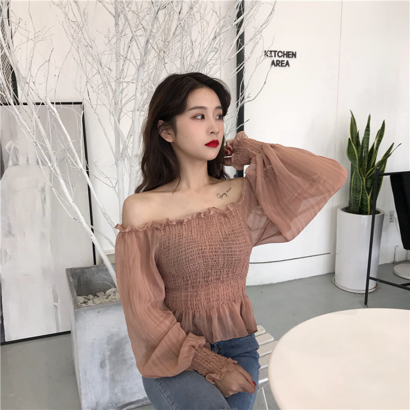 秋裝女2018新款一字肩燈籠泡泡袖女士白色蕾絲雪紡長袖上衣拼接衫