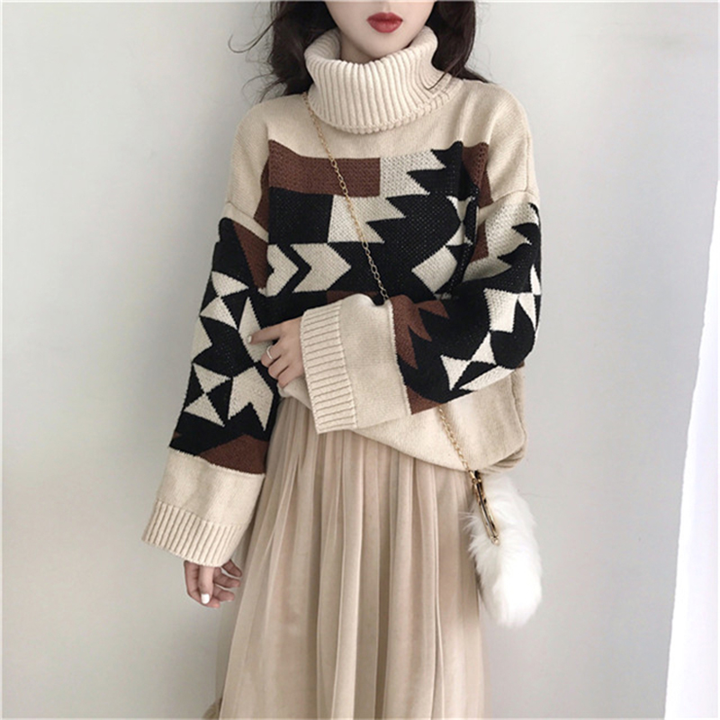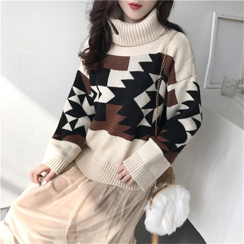 慵懶風高領毛衣外套女冬裝2018新款韓版寬松幾何圖撞色長袖針織衫