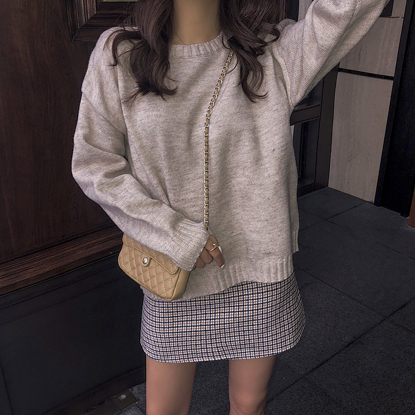 韓版小清新純色寬松慵懶風圓領網紅毛衣女2018新款+格紋半身裙