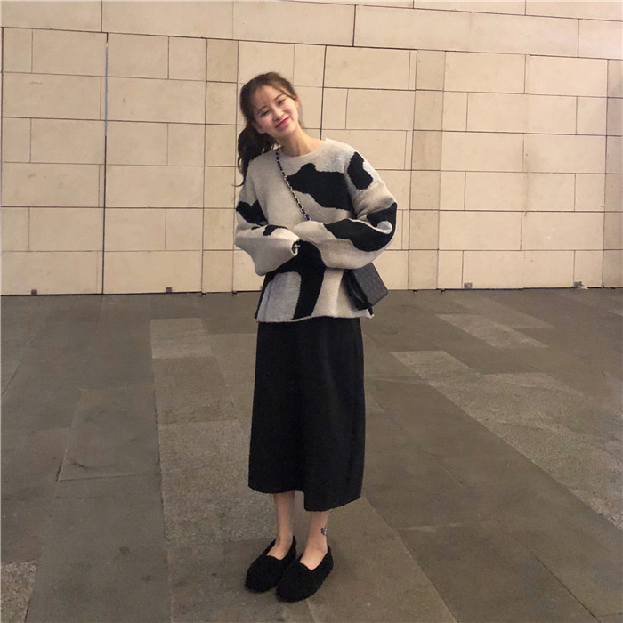 / 冬韓版套頭保暖厚寬松奶牛毛衣上衣時尚套裝純色顯瘦開叉半身裙女