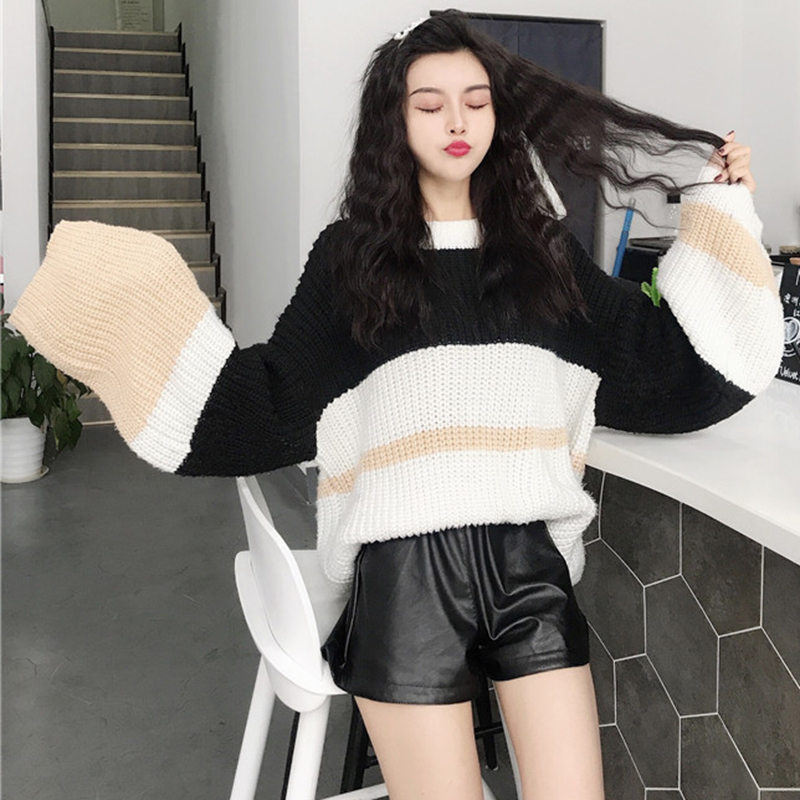 學生寬松毛衣女秋冬裝2018新款慵懶針織外套時尚拼色休閑長袖上衣