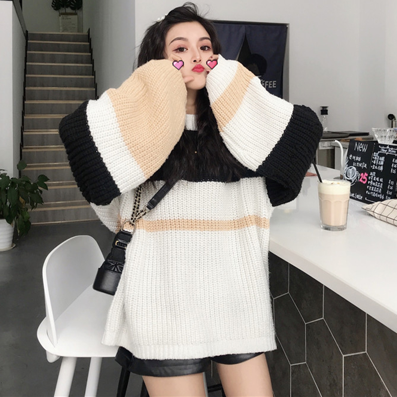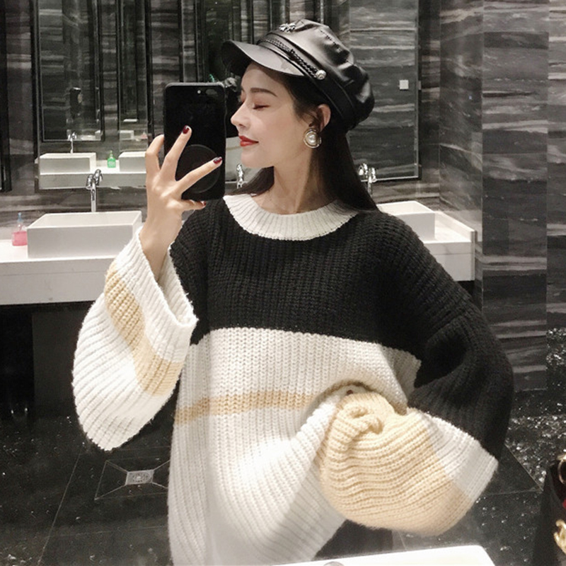 / 學生寬松毛衣女秋冬裝2018新款慵懶針織外套時尚拼色休閑長袖上衣