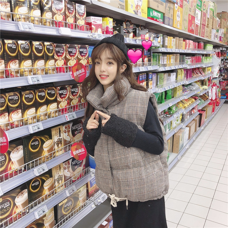 / 2018新款秋冬女裝韓版學院風復古寬松格子棉衣面包服馬甲背心外套