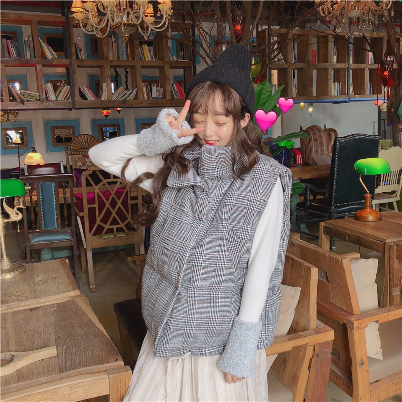 2018新款秋冬女裝韓版學院風復古寬松格子棉衣面包服馬甲背心外套