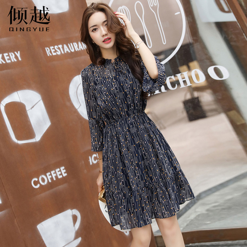 / 2017夏季新款韓版女裝修身收腰顯瘦碎花雪紡連衣裙女中長款a字裙