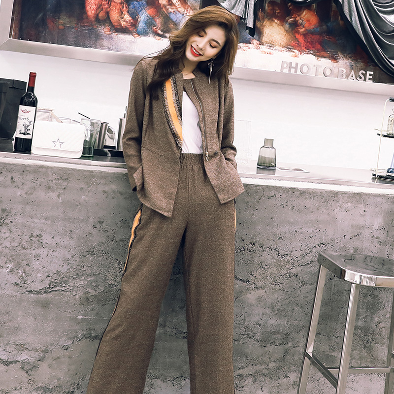 歐洲站2018秋冬裝新款收腰時尚休閑長袖外套闊腿褲套裝洋氣兩件套
