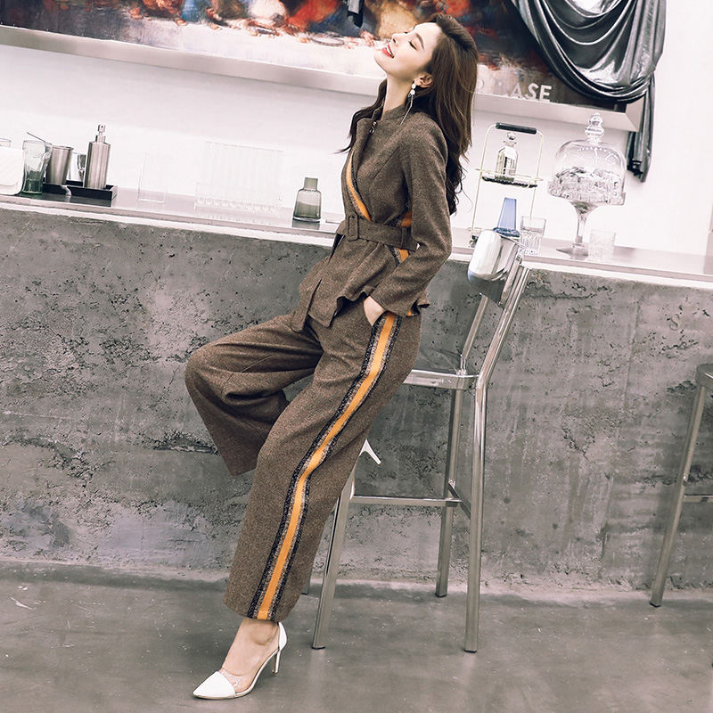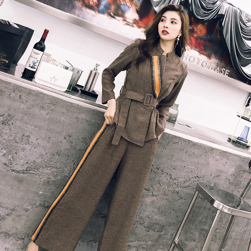 / 歐洲站2018秋冬裝新款收腰時尚休閑長袖外套闊腿褲套裝洋氣兩件套