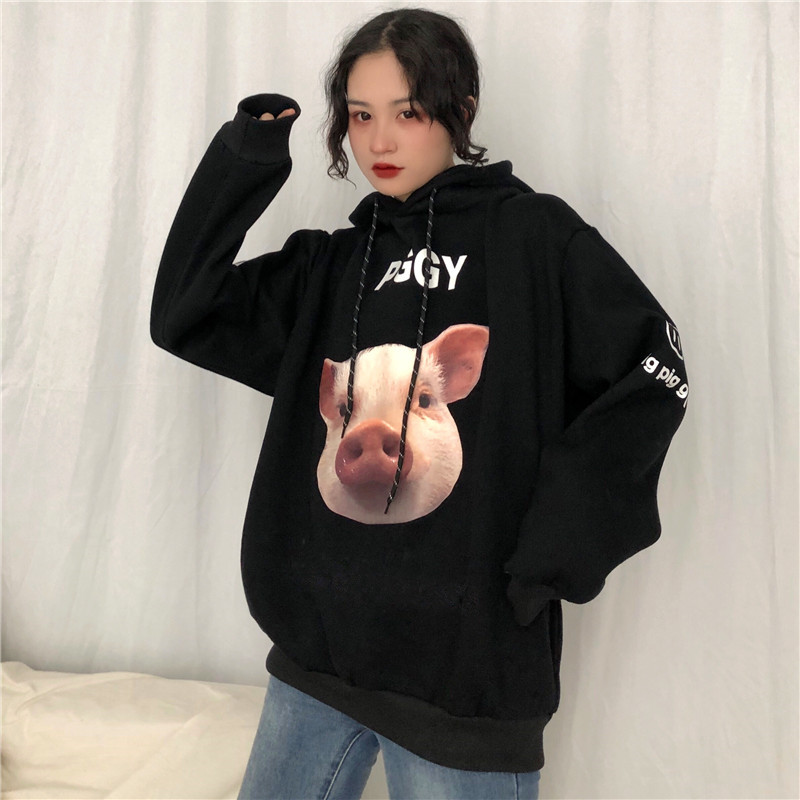 / 秋冬女裝韓版中長款原宿風卡通豬豬字母情侶連帽加厚衛衣上衣外套
