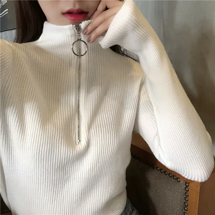 韓版chic早秋毛衣慵懶風氣質半高領圓環拉鏈修身長袖打底針織衫潮