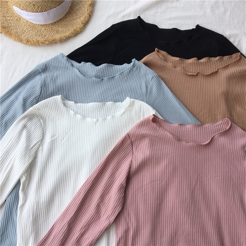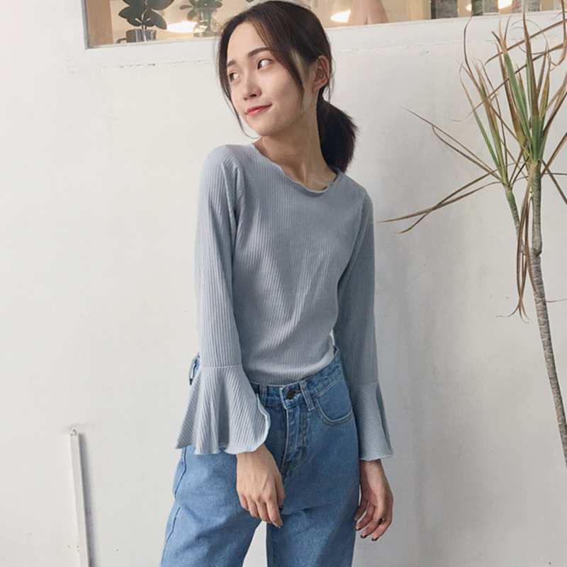 初秋新款女裝喇叭袖長袖百搭純色簡約寬松顯瘦學生打底衫T恤上衣