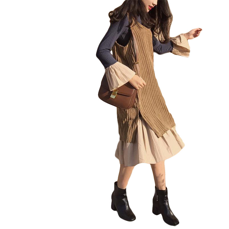 / 韓版秋季女套裝chic修身中長款喇叭袖連衣裙+燈芯絨背心裙兩件套
