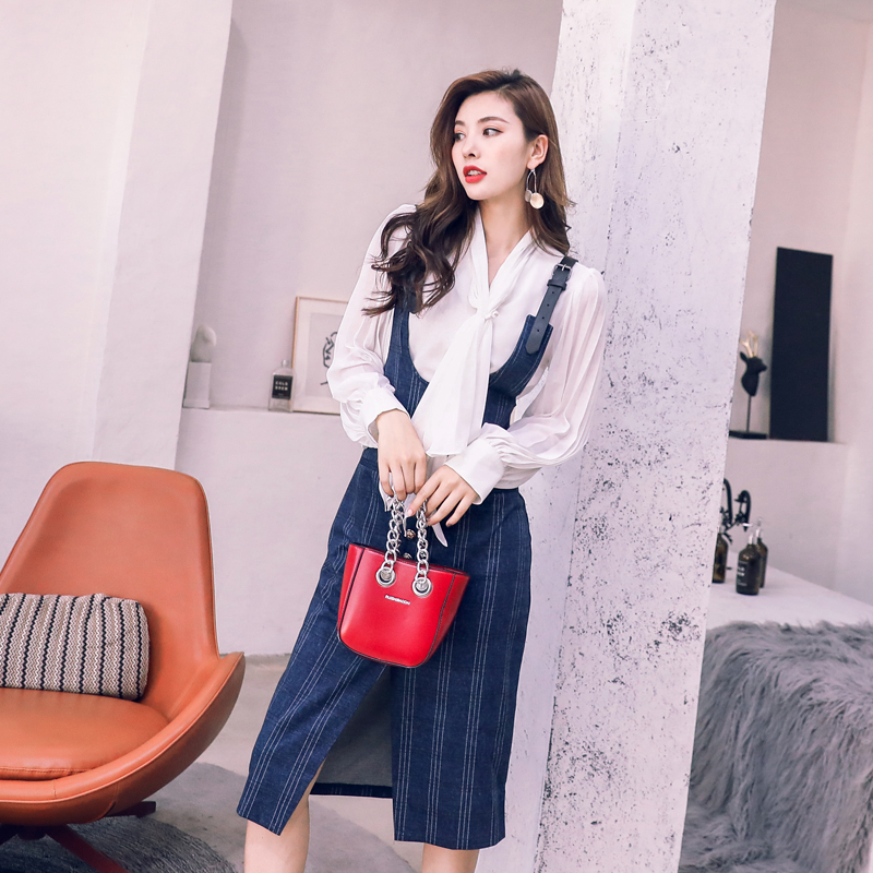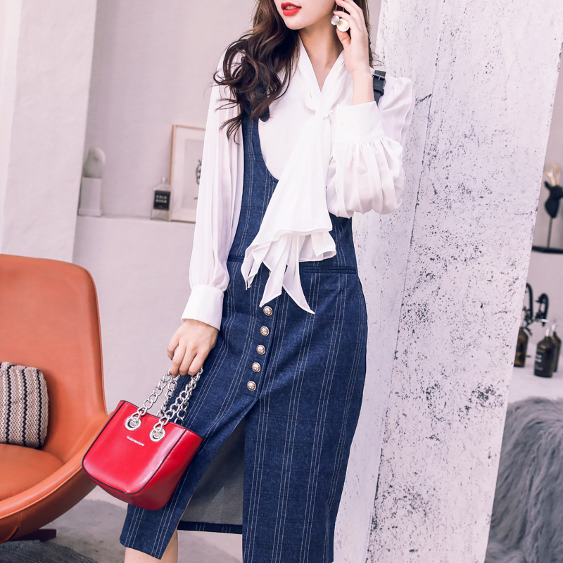 / 牛仔連衣裙女秋2018新款減齡顯瘦洋氣長袖襯衫背帶套裝裙兩件套潮