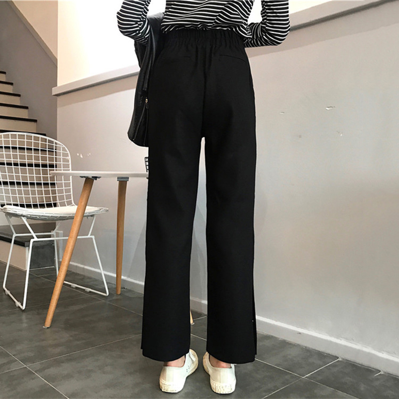 秋裝女2018新款寬松褲腳開叉扣子裝飾直筒褲子松緊高腰黑色休閑褲