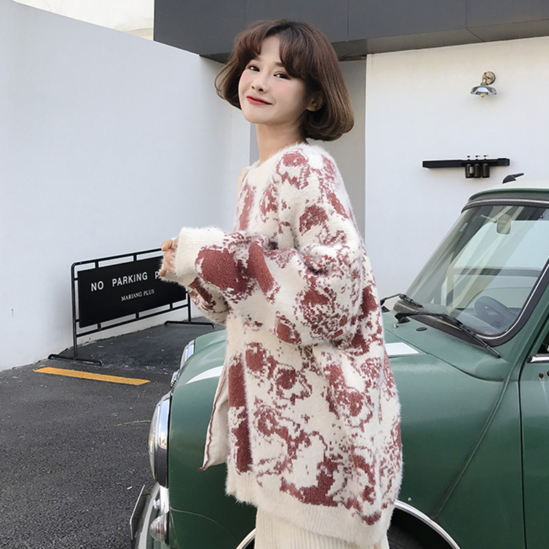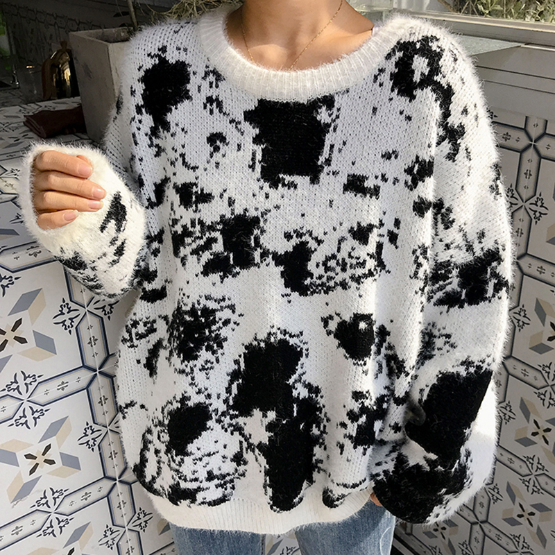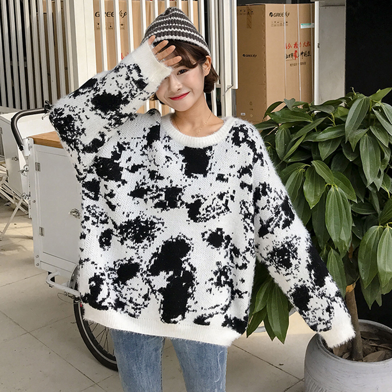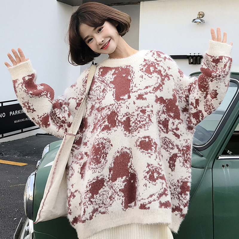 時尚迷彩套頭毛衣女秋冬裝2018新款慵懶針織外套寬松長袖圓領上衣