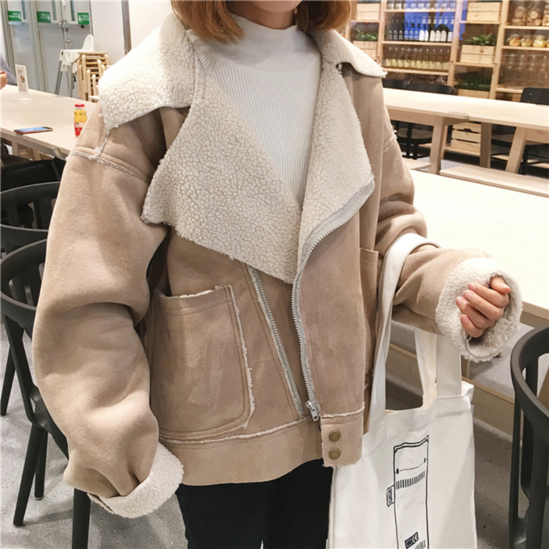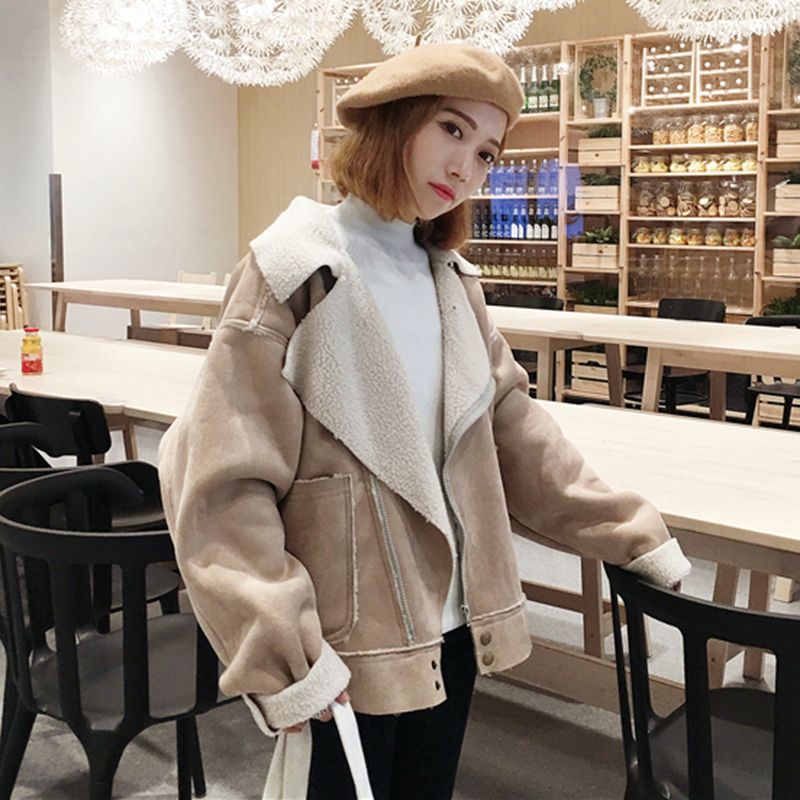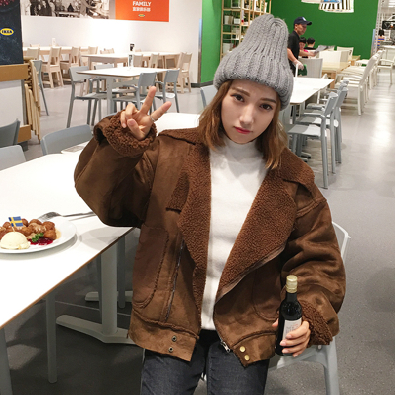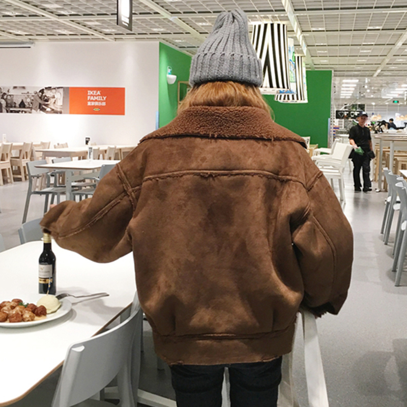 / 秋冬季新款寬松鹿皮絨拼接羊羔毛外套女裝韓版保暖長袖上衣女學生