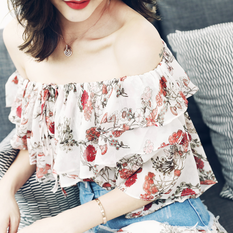 / S秀淑女氣質2018夏季新款露肩印花雪紡連衣裙牛仔腰封兩件套潮