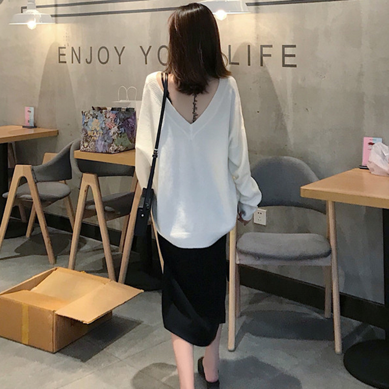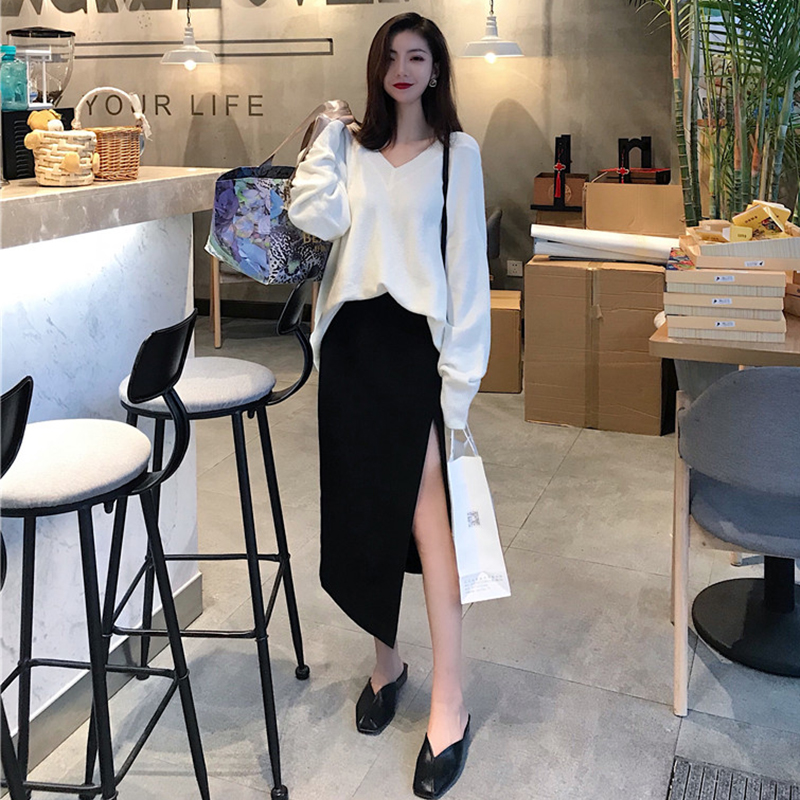/ 女秋裝2018新款慵懶寬松長袖V領毛衣純色上衣高腰開叉半身裙套裝