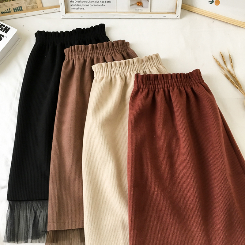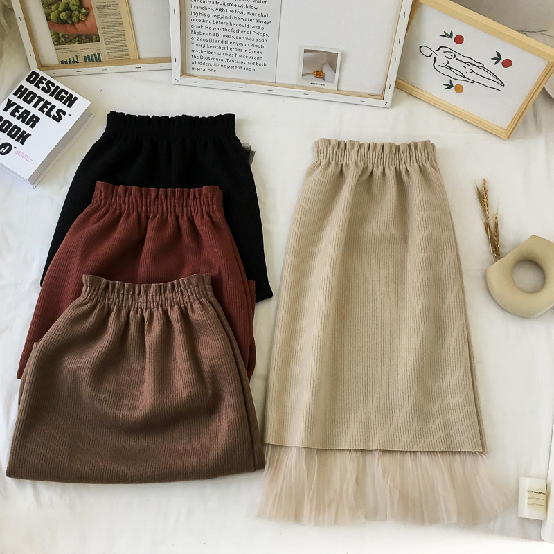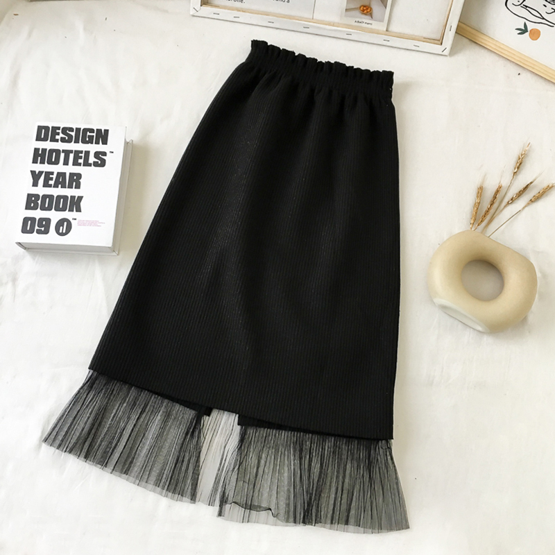 / 高腰顯瘦網紗拼接呢子半身裙女秋冬裝新款韓版chic黑色A字中長裙