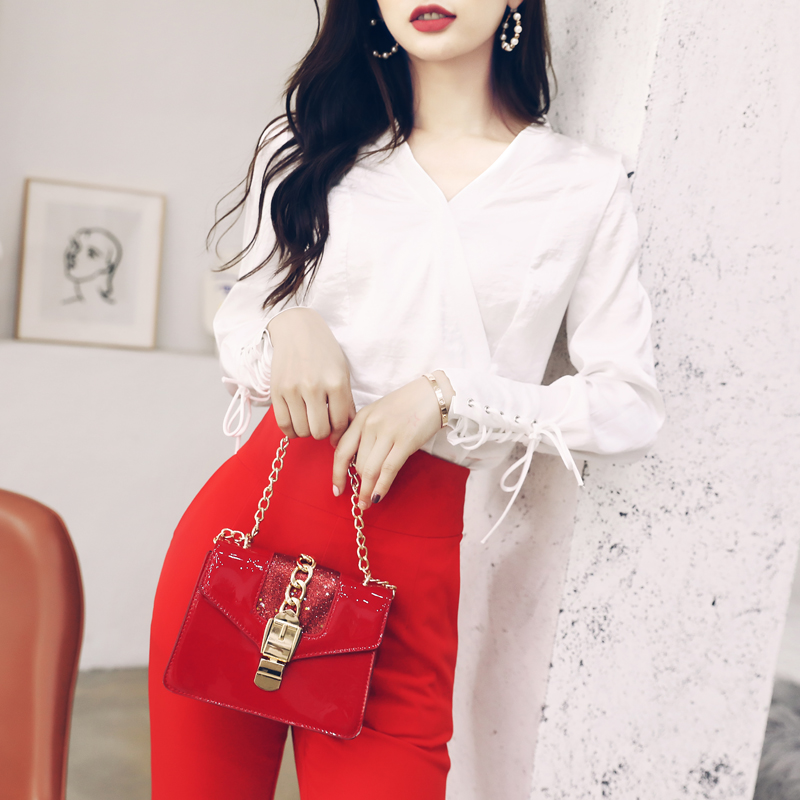 港味復古chic風新款韓版V領長袖襯衣高腰顯瘦喇叭褲時尚氣質套裝