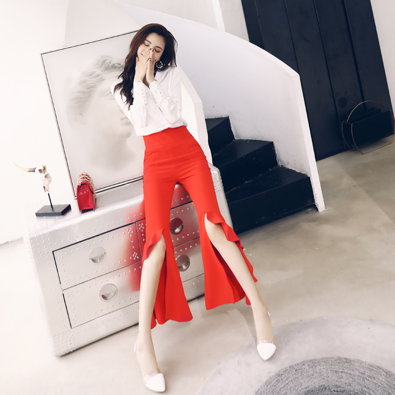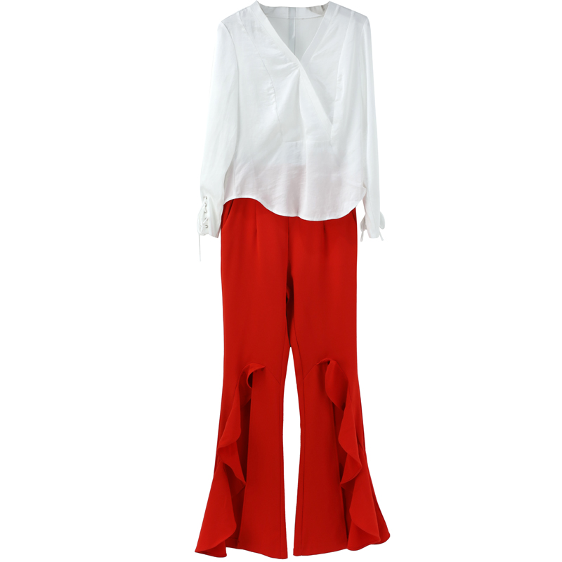 / 港味復古chic風新款韓版V領長袖襯衣高腰顯瘦喇叭褲時尚氣質套裝