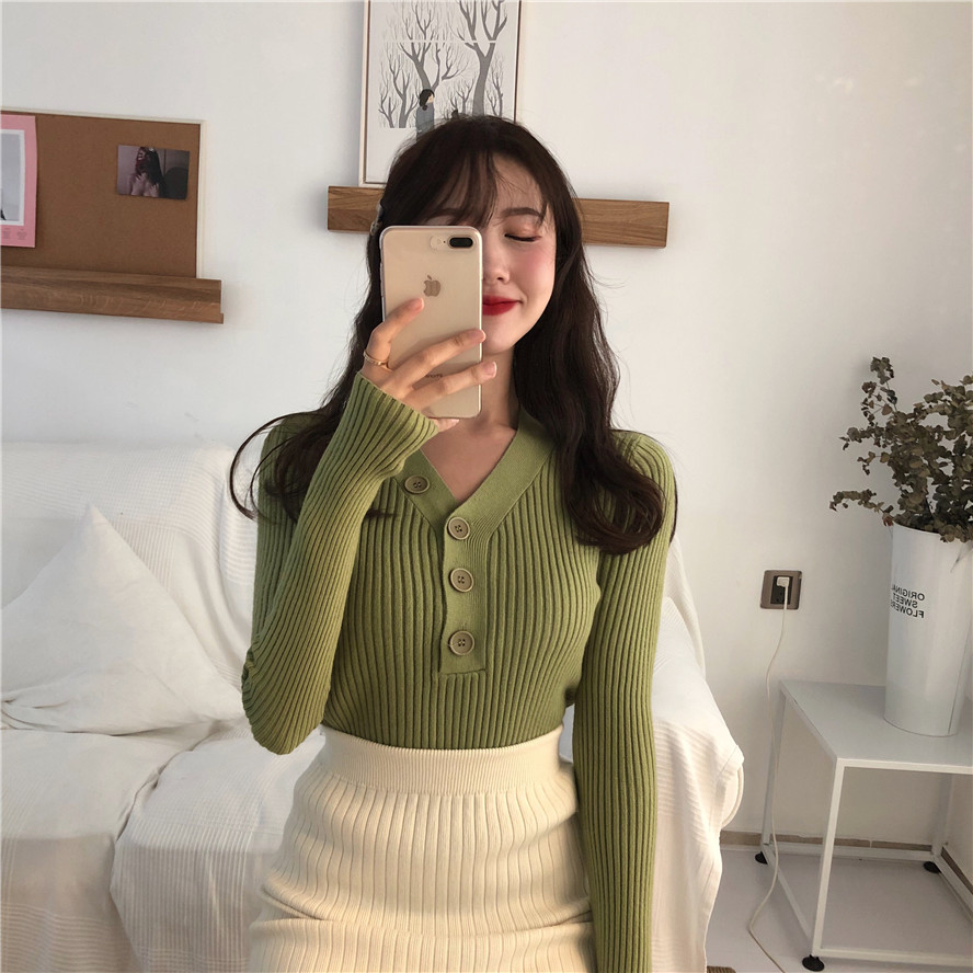 / 上衣新款韓版百搭復古V領一排扣針織衫毛衣長袖修身套頭打底衫潮