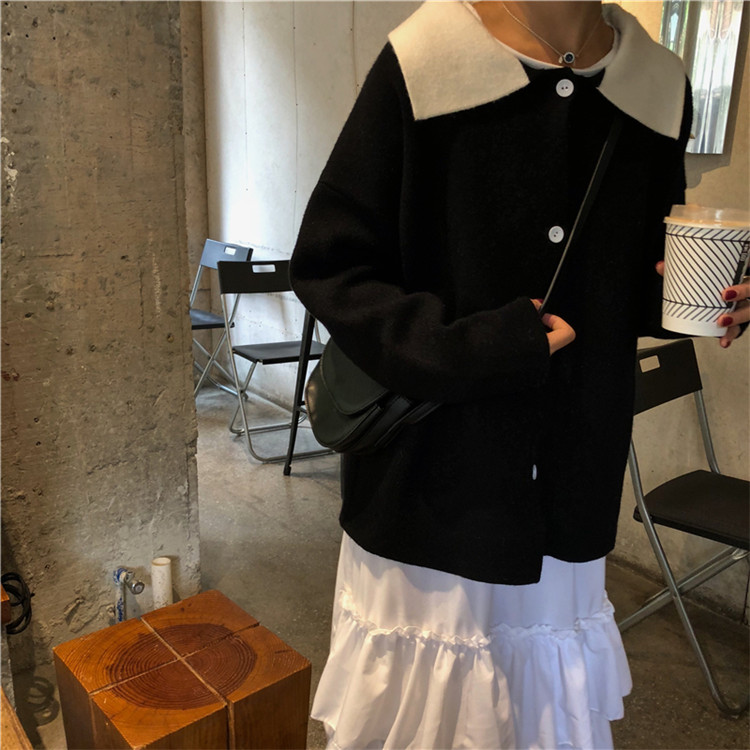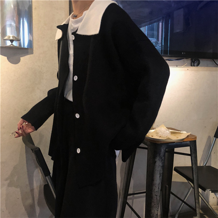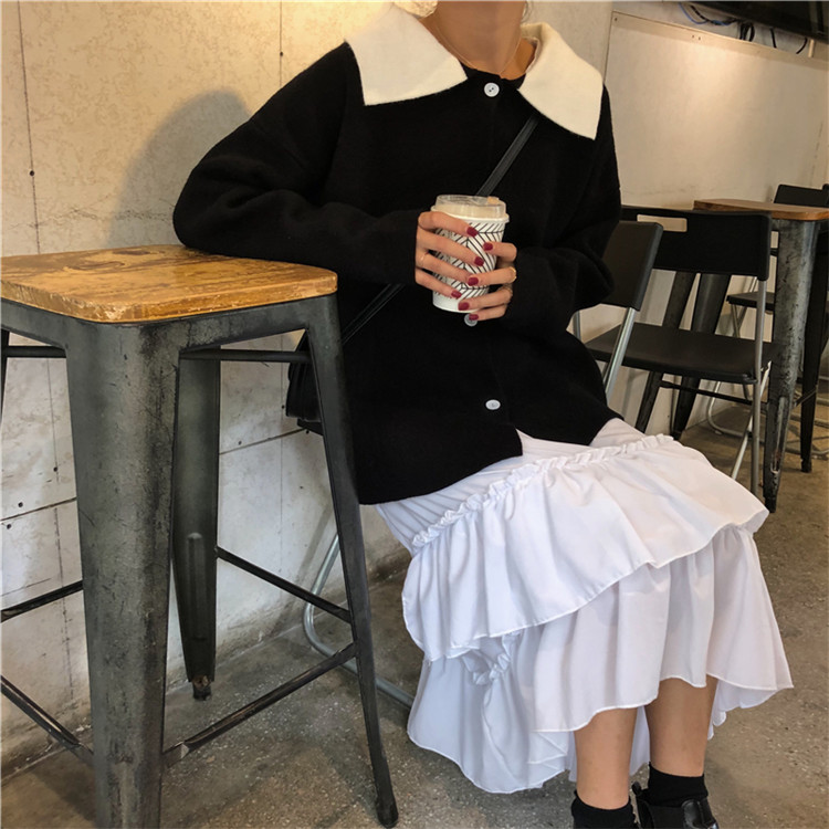 2018新款秋冬女裝韓版寬松百搭polo領拼色開衫針織衫毛衣上衣外套