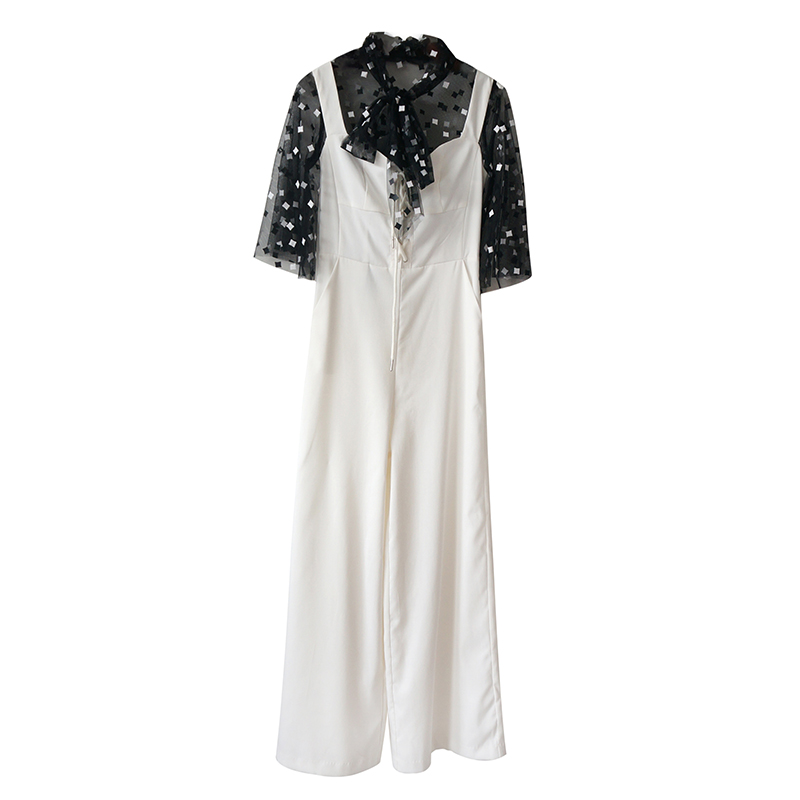 俏皮套裝女兩件夏韓版氣質網紗中袖上衣打底衫白色高腰背帶連體褲