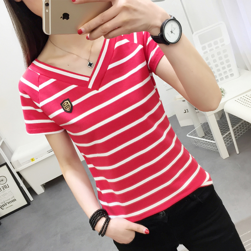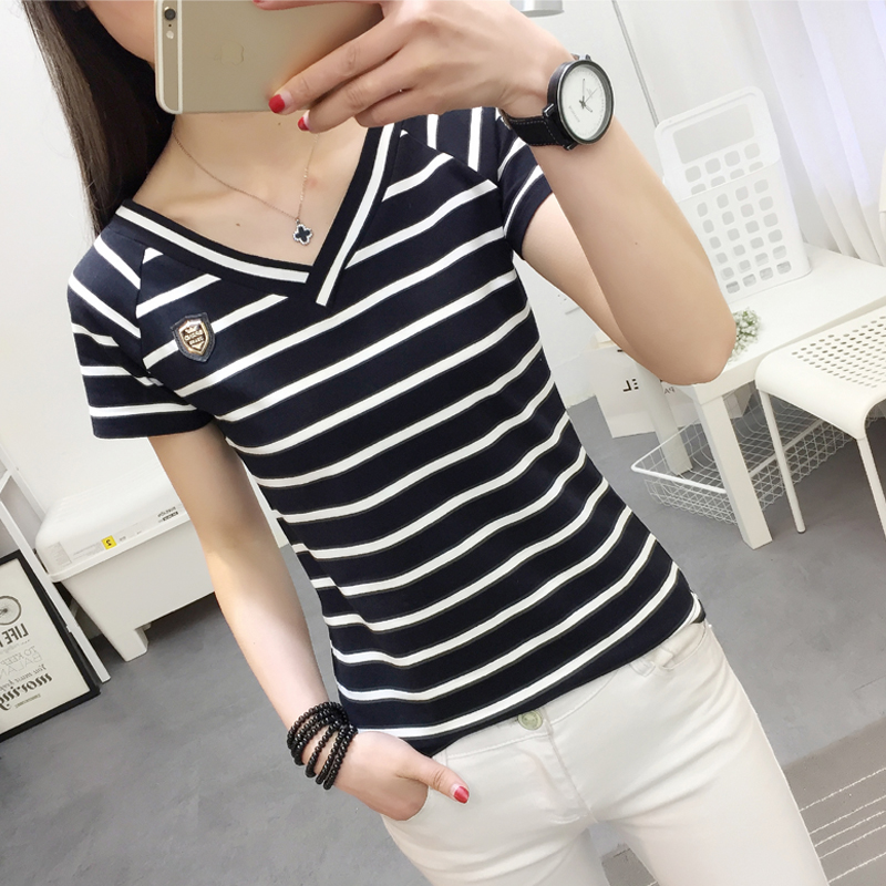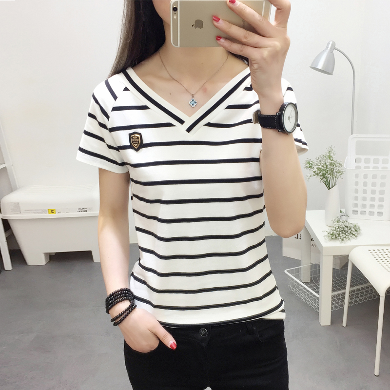女裝2017新款純棉條紋短袖t恤女夏季新款V領半袖體恤女打底衫上衣