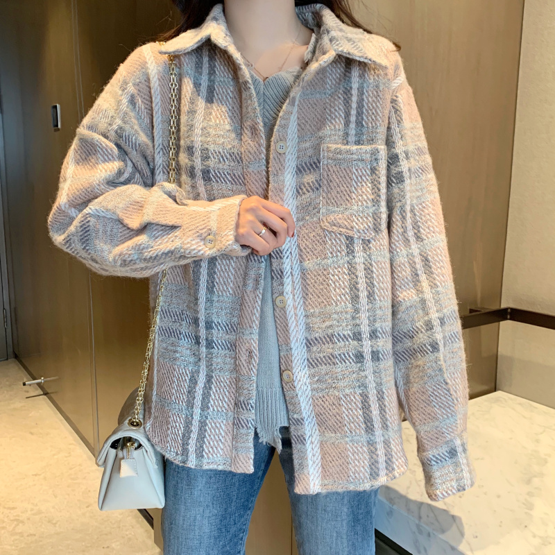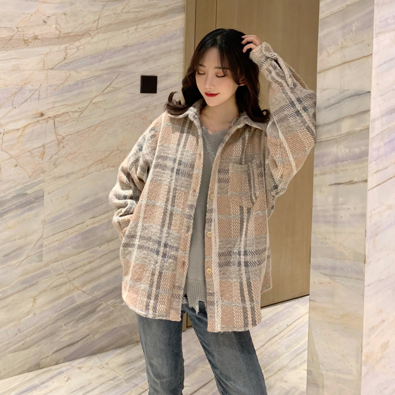 / 寬松粉色格子紋中長款長袖羊毛呢子大衣毛呢外套女秋冬2018新款潮