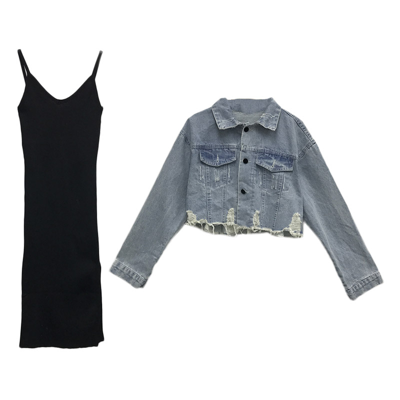 / chic早秋套裝女時尚百搭網紅復古港味顯瘦牛仔外套吊帶裙兩件套