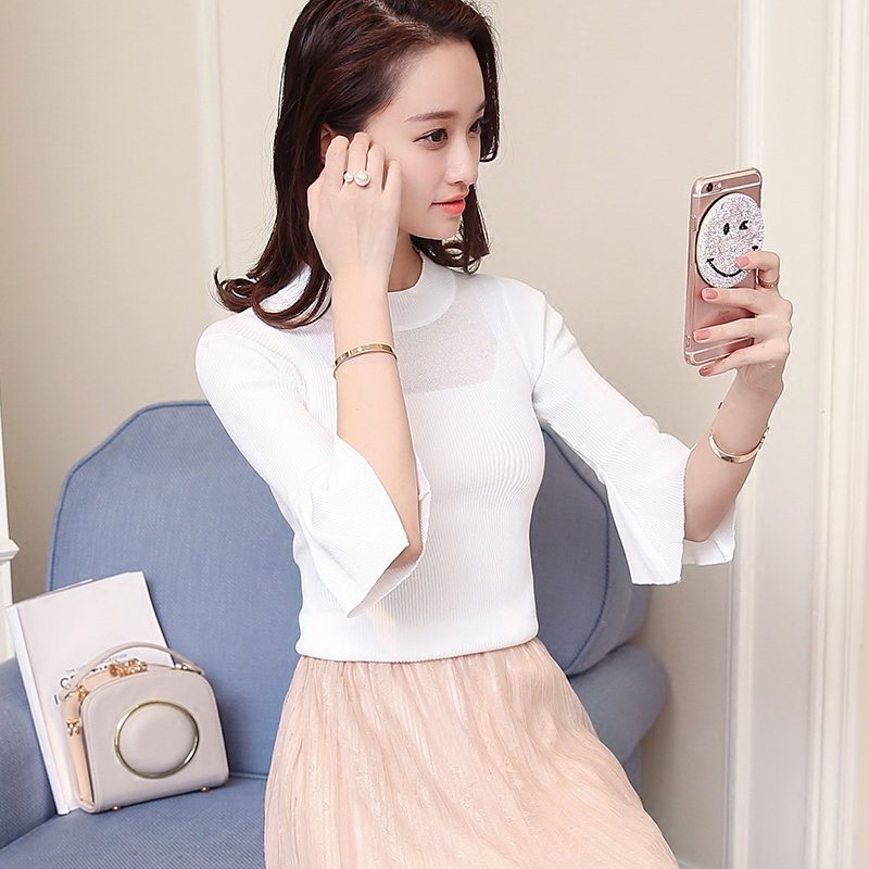 宜朵夏季喇叭袖針織衫上衣女修身套頭七分中袖針織衫T恤女薄短款