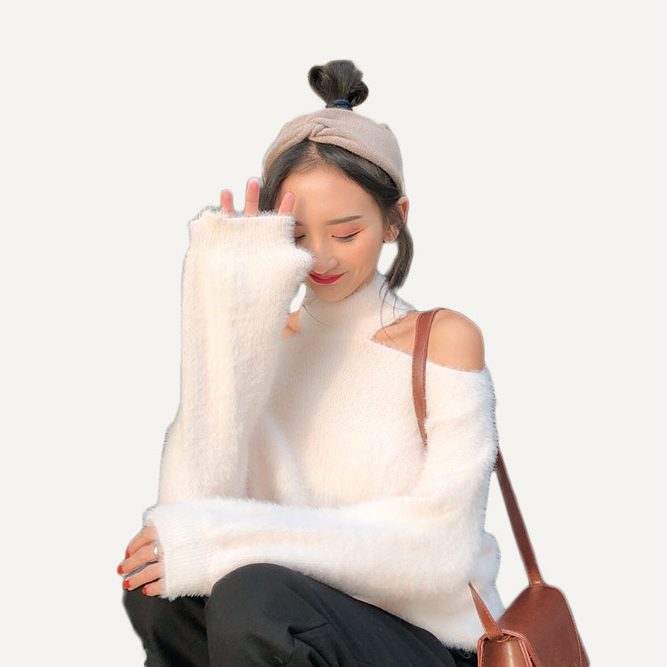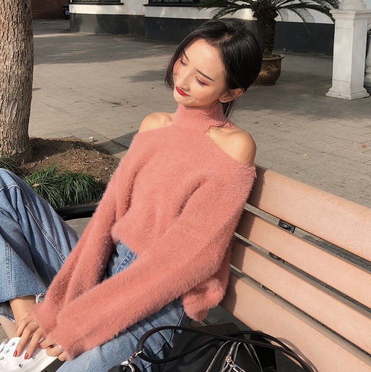 韓系時尚網紅毛衣女2018新款寬松慵懶風百搭毛絨絨掛脖露肩上衣潮