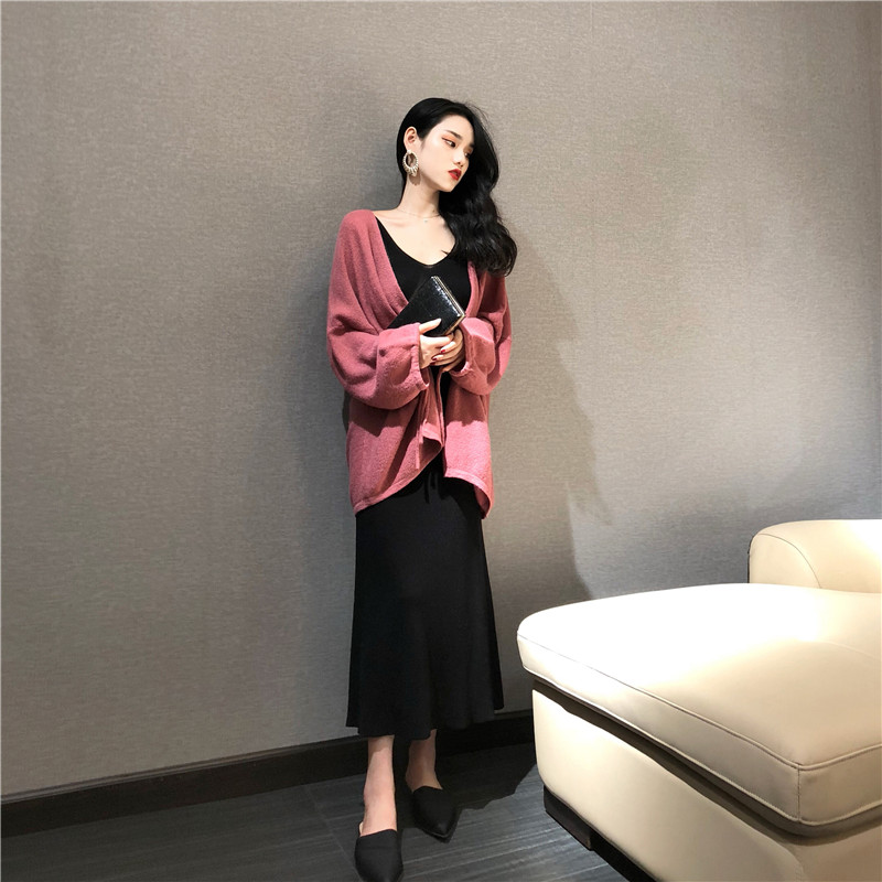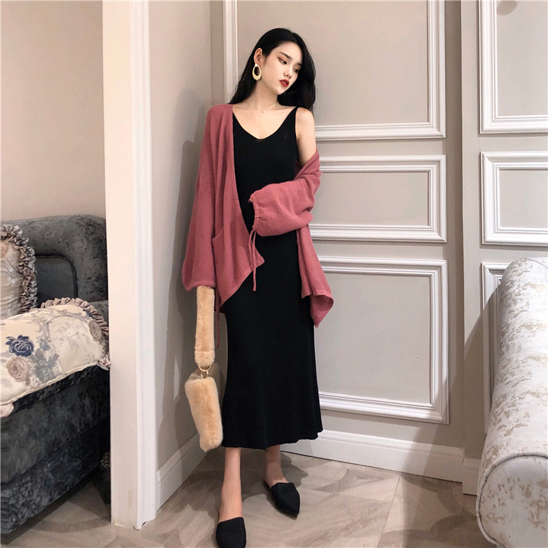 秋裝女2018新款韓國復古修身顯瘦V領吊帶針織裙+慵懶毛衣開衫外套