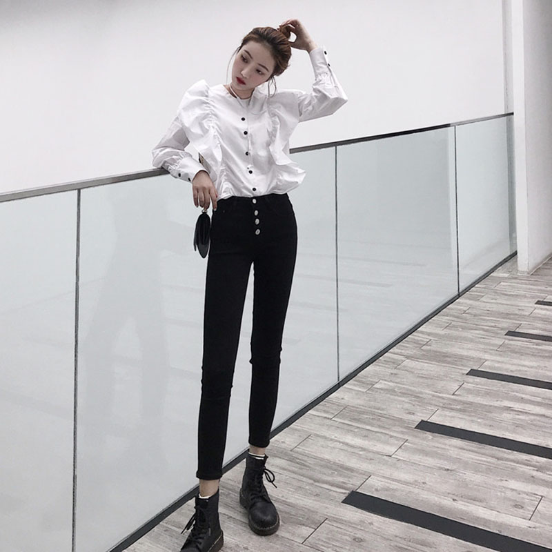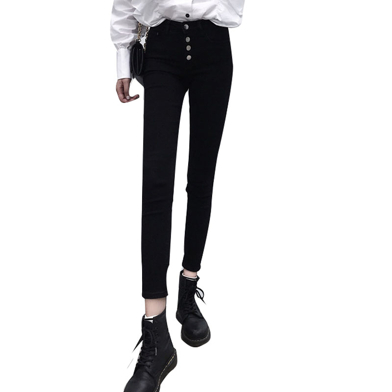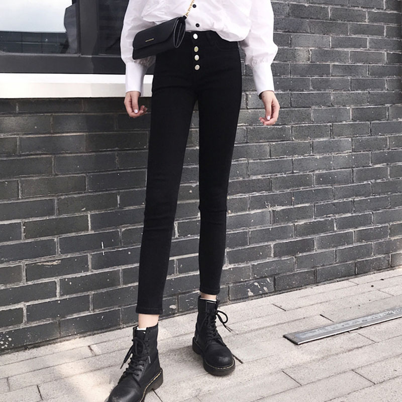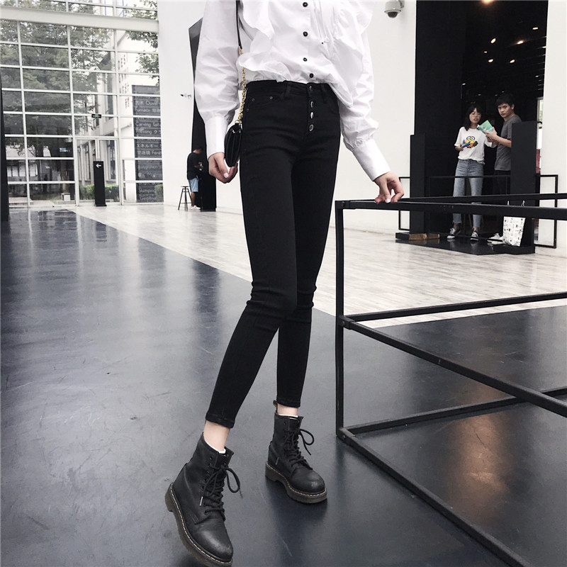 韓版顯瘦百搭排扣黑色牛仔褲女春秋2018新款學生緊身小腳鉛筆褲子