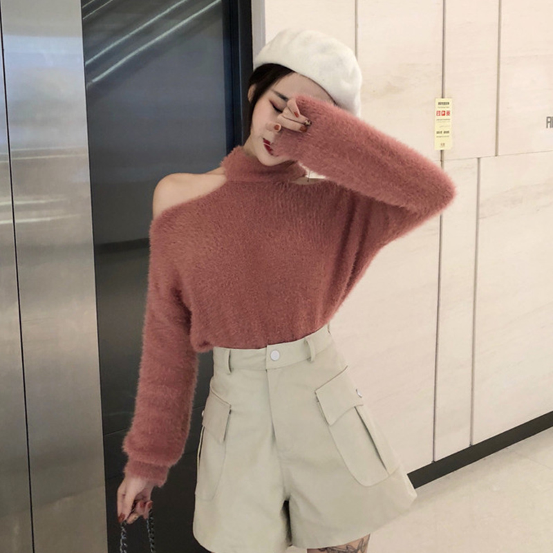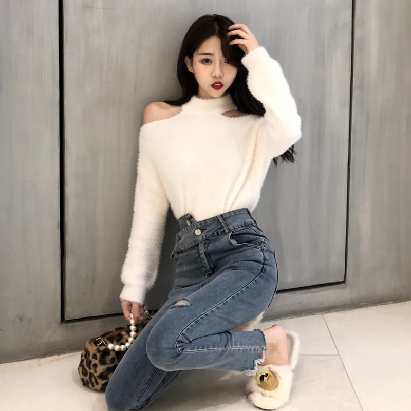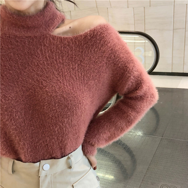 秋冬女裝2018新款心機掛脖露肩長袖毛衣學生氣質白色毛絨針織上衣