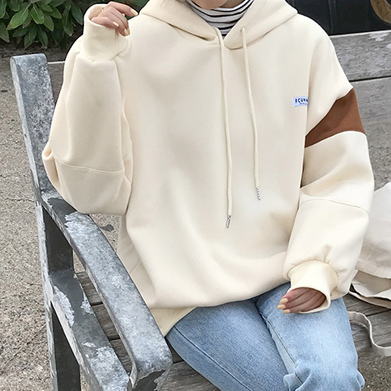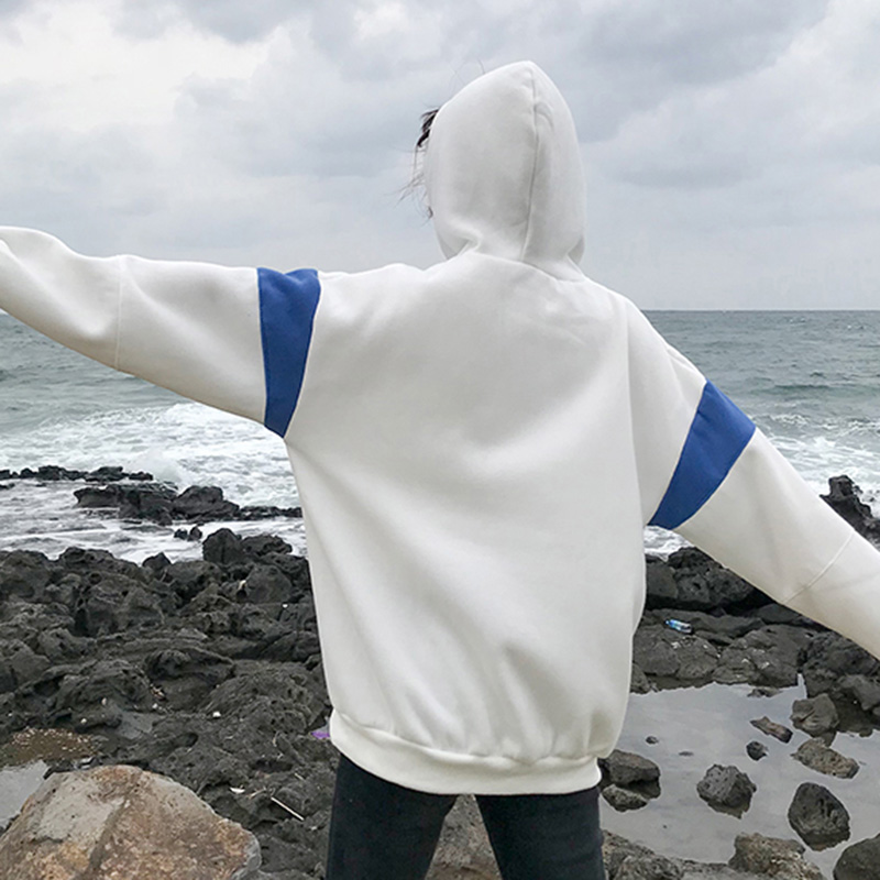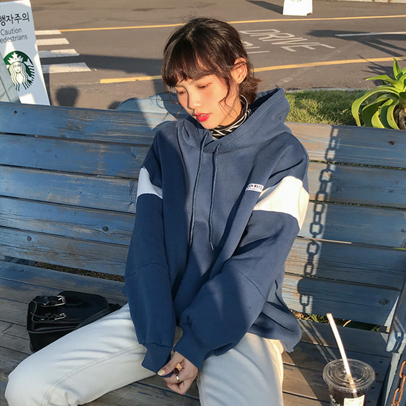 / 時尚撞色加絨衛衣秋冬女裝2018新款休閑連帽外套學生寬松長袖上衣
