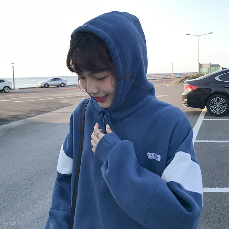 時尚撞色加絨衛衣秋冬女裝2018新款休閑連帽外套學生寬松長袖上衣